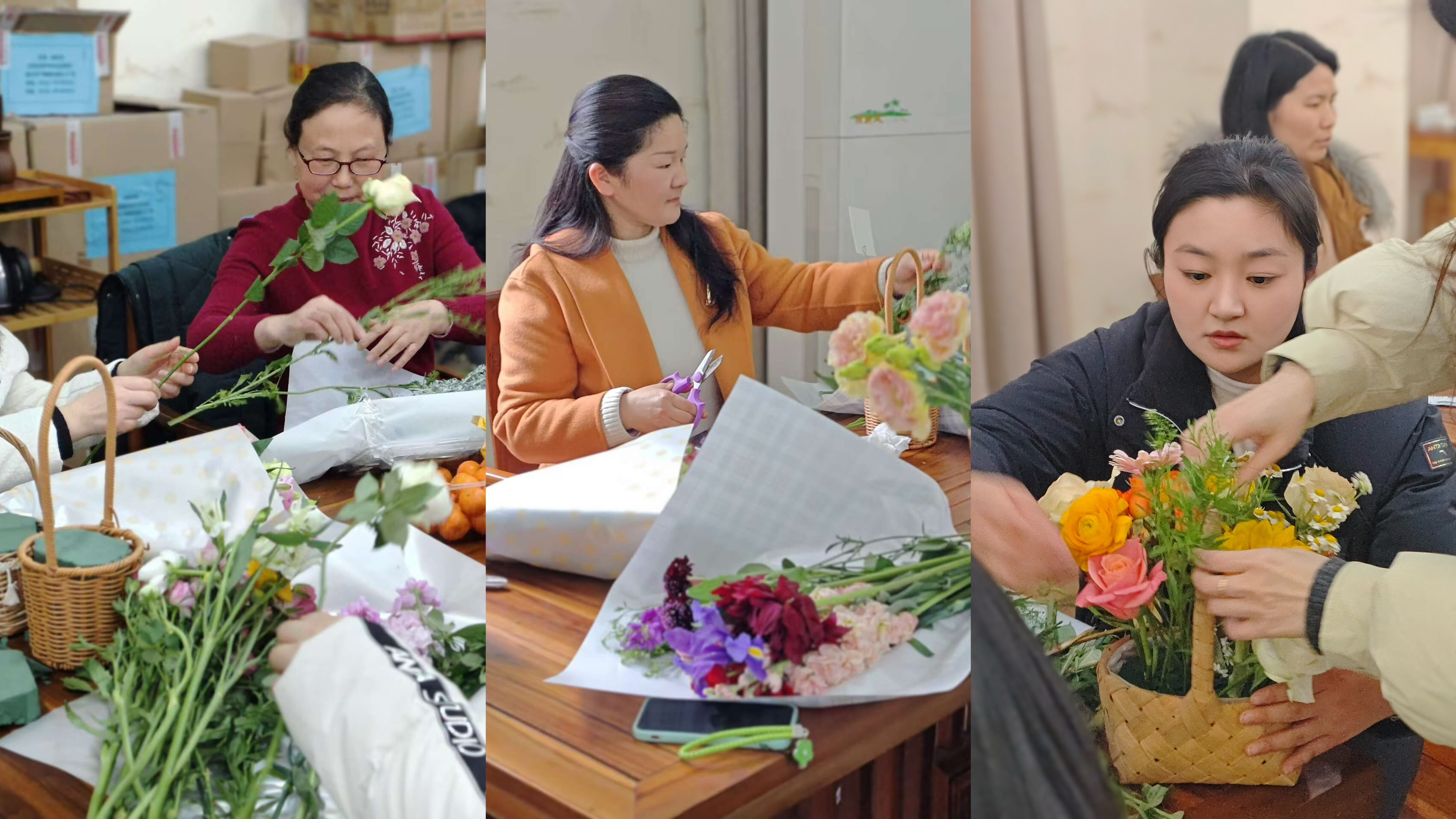 在自由创作环节,女职工们纷纷动手尝试,不时交流工作和生活心得,分享自己的家风故事。大家挑选花卉,修枝剪叶,一朵朵鲜花在她们的手中绽放成美丽的花艺作品,不仅展现了在场女职工们的审美品味与花艺技巧,还成了她们独立自强、家风传承的生动载体。