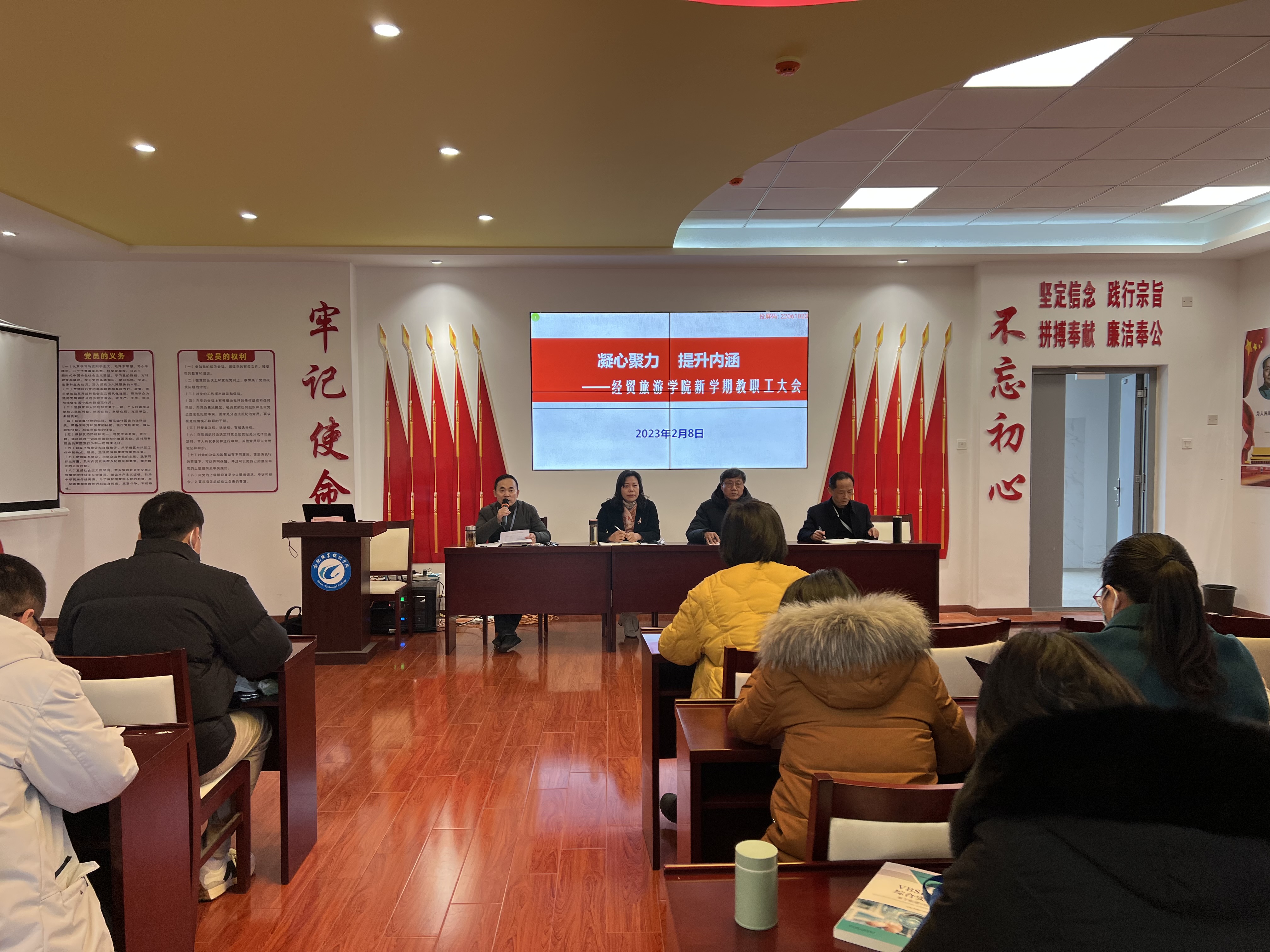 为推动新学期工作有序、高效开展,2月8日下午,大棒一进一出大大爽在党性体验馆召开了以“凝心聚力、提升内涵”为主题的教职工大会,学院党政和全体教职工参会,会议由副院长陈继林主持。