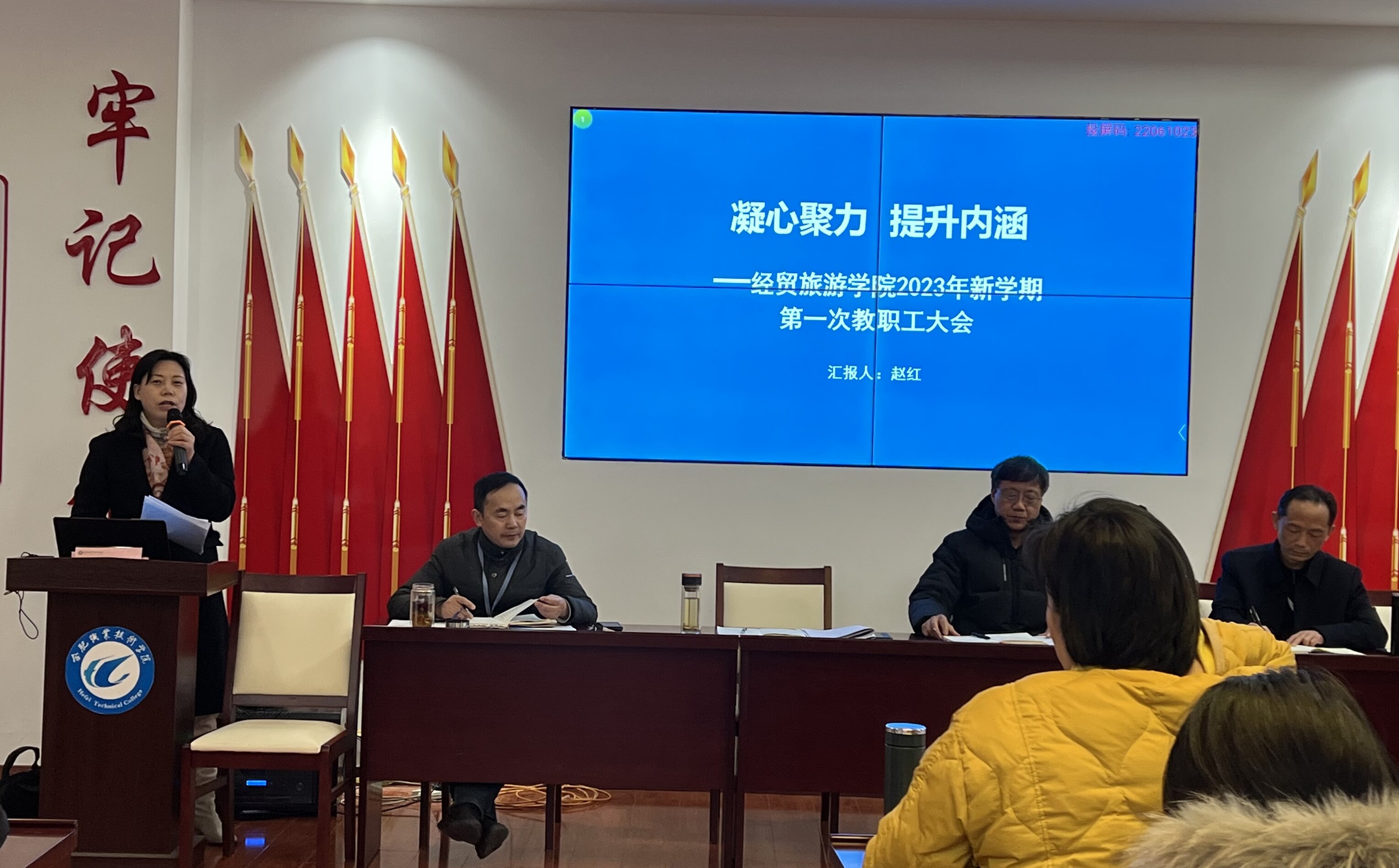 赵红院长传达了2023年学校工作务虚会精神、校党委书记王杰才同志的主要讲话精神并作总结报告。她指出,2022年,在全院教职工的共同努力下,学院在党建和发展工作方面“稳中有进”,成绩显著。新学年,新气象,我们更应满怀信心,齐心协力,克服困难,紧紧围绕学校“聚焦高质量”发展主题,改进作风提状态、提高标杆定目标,坚持问题导向补短板,凝心聚力、提升内涵,争取实现学院工作更大发展,为学校“双高”计划申报、争创职教本科添砖加瓦!