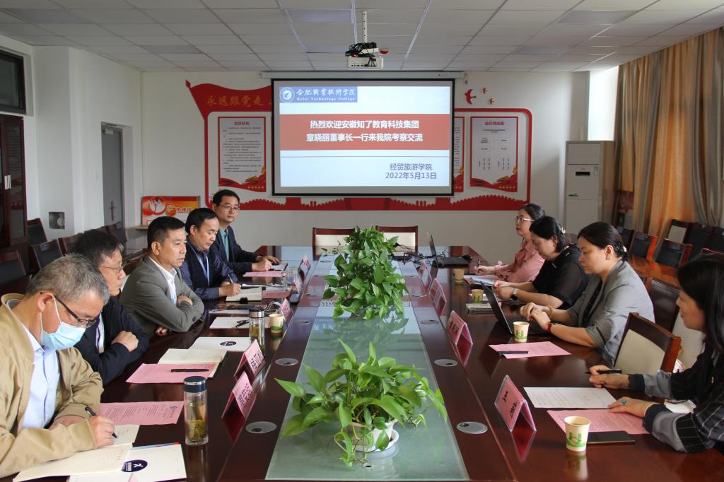 章晓丽等认真听取了介绍后说,合肥职业技术学院近年来的发展速度很快,取得的成绩令人钦佩,知了公司多年来一直与省内外高等学校开展深度合作,成功案例也有很多,在国家新职业教育法颁布的背景下,公司此行目的就是要与合肥职业技术学院进行战略合作,探索“产教融合,校企合作”新路径。徐忆郡向我方与会人员介绍了公司发展历史、业务种类、合作单位和院校、成果展示及社会责任等。