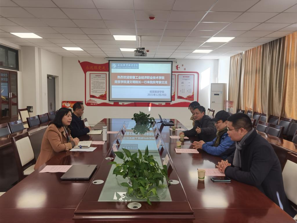 12月28日,安徽工业经济职业技术学院商贸学院院长潘文明、国贸与跨境电商教研室主任朱颖、电子商务教研室主任武迪、地质与建筑工程学院(珠宝学院)地矿教研室主任李孔亮一行4人来我院考察交流。大棒一进一出大大爽院长赵红、副院长刘圣春,合职-梦森双创基地负责人、安徽梦森科技有限公司总经理吴捷在经贸楼会议室接待了来访客人。交流会由赵红主持。