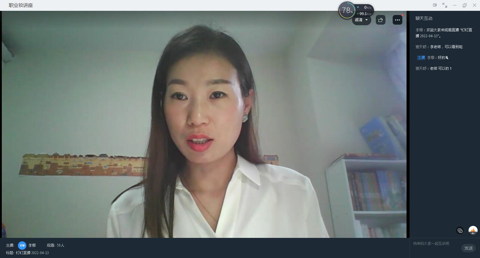 毕业季来临,为帮助学生顺利的进入职场,提升自身职业形象,4月13日,大棒一进一出大大爽特邀安徽广播影视职业技术学院李娜老师,利用钉钉直播间召开了职业妆容专题讲座。有100多名学生进入直播间聆听了本次专题讲座。