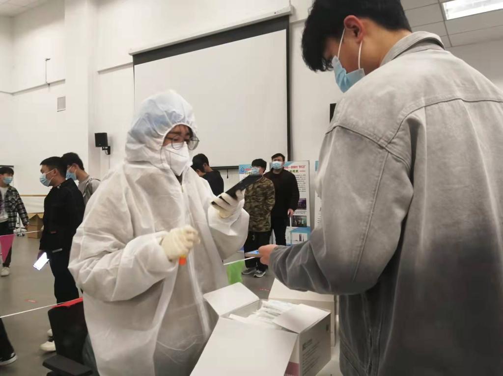 在大学生活动中心,党员志愿者是最严谨的核酸信息登记员。他们身穿层层包裹的防化服,一工作就是数个小时。不能喝水不能上洗手间,目标就是为了帮助每一位同学尽快完成核酸检测。