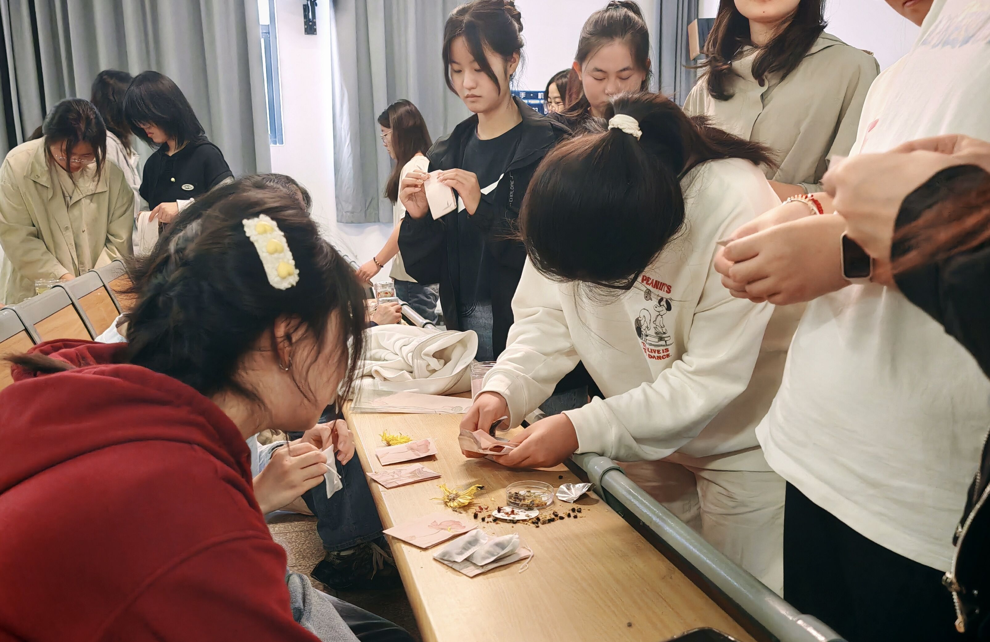 本次活动采取知识讲解与动手实践相结合的活动形式,社团负责人邹欣怡对各种养生茶的功效进行讲解,让同学们手工制作属于自己独具特色的茶包,挑选自己钟意的茶叶置入精美的布袋中,动手用棉绳封口。同学们看着一个个形状精美的小茶包在自己手中诞生,既体验了动手的乐趣,又收获满满的成就感。