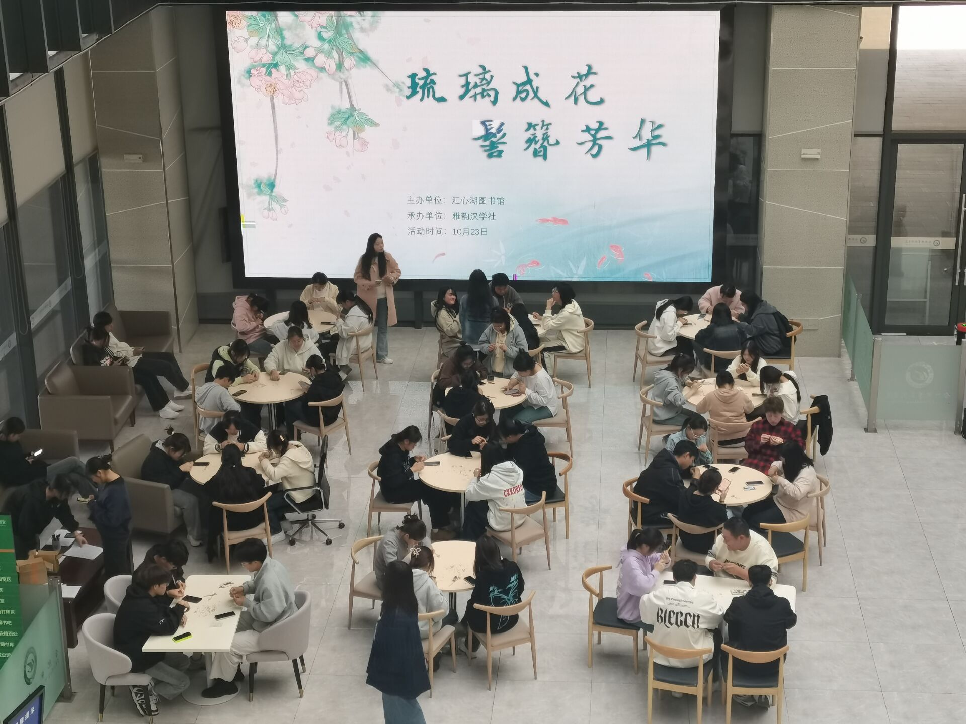 为传承和弘扬中华传统文化,丰富广大在校同学文化生活,我校大棒一进一出大大爽雅韵汉学社于10月23日下午在汇心湖校区图书馆二楼举办了一场别开生面的“琉璃成花,髻簪芳华”活动。