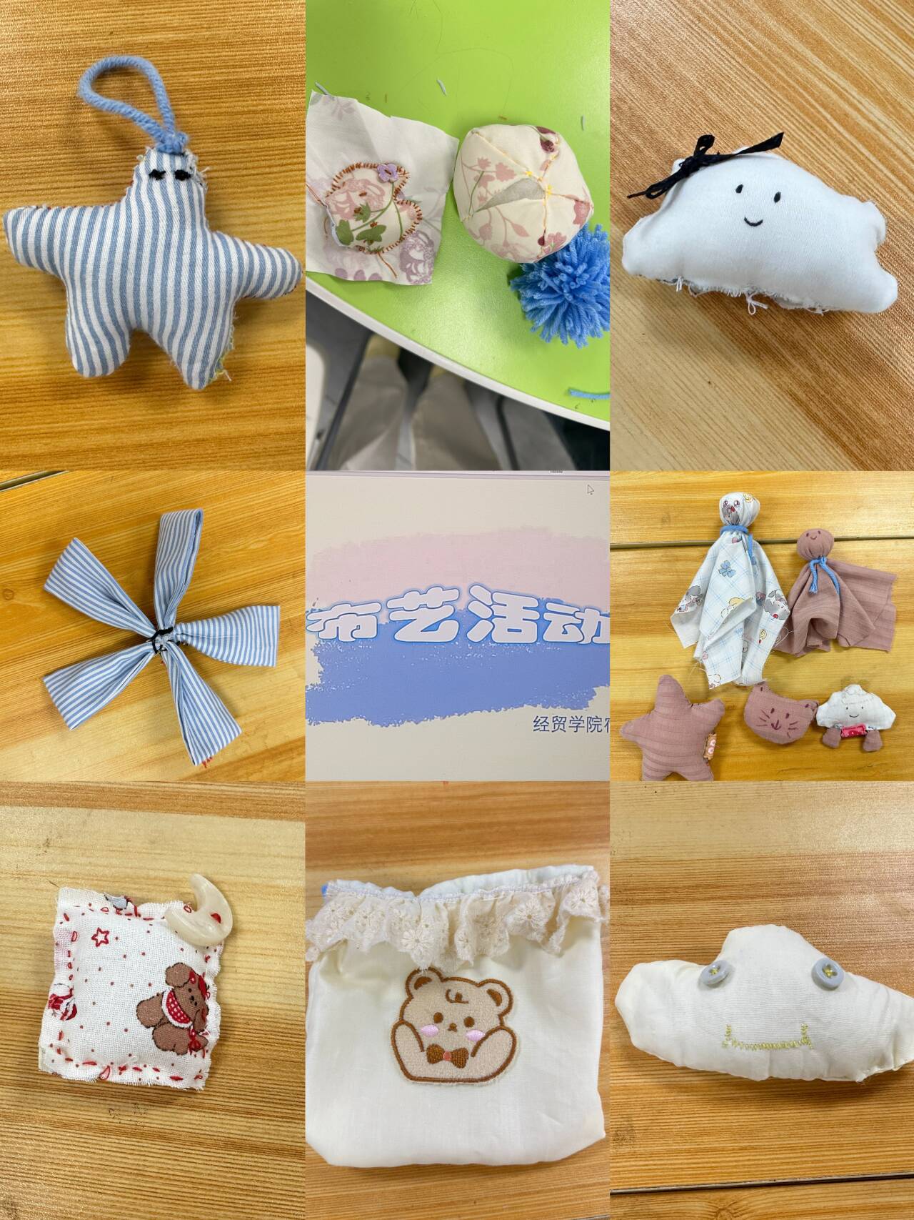 经过几个小时的努力,一件件精美的布艺作品在学生们的手中诞生。从不同角度拍摄的成果图片中可以看到,有憨态可掬的小熊玩偶、云朵形状的抱枕、花朵图案的香包等,每一件作品都展现了学生们的创意和才华,制作的成品可带回宿舍留作装饰用途。