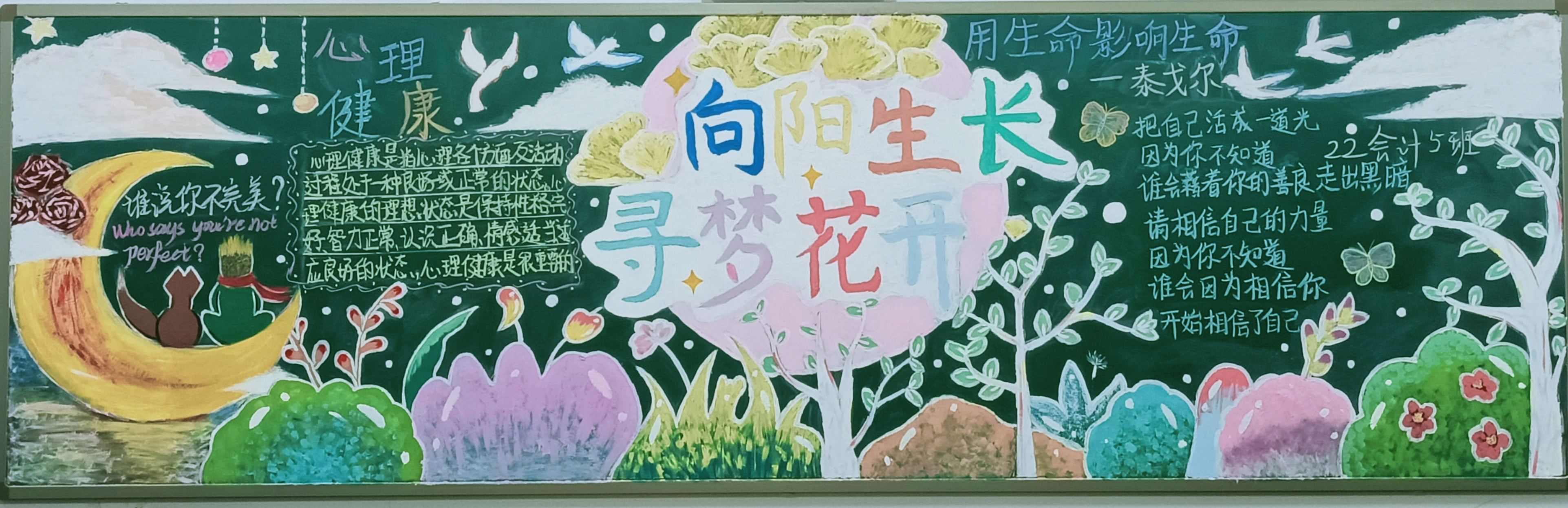 此次心理健康主题黑板报评比活动,能够普及心理健康基础知识且营造良好的心理健康氛围,引导学生树立正确的健康观念和提高学生心理健康意识。活动最后从主题、版面、板书、内容等方面进行考核,最终评选出一等奖为22大数据与会计5班,二等奖为22大数据与会计2班和大数据与会计1班,三等奖为22大数据与会计4班、22会计信息管理班和22旅游管理2班。