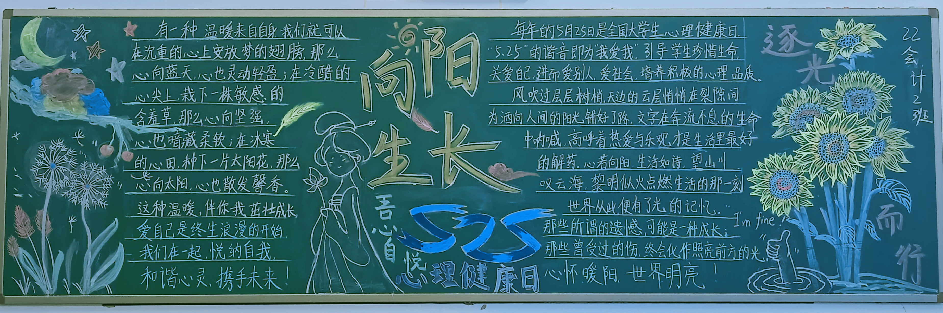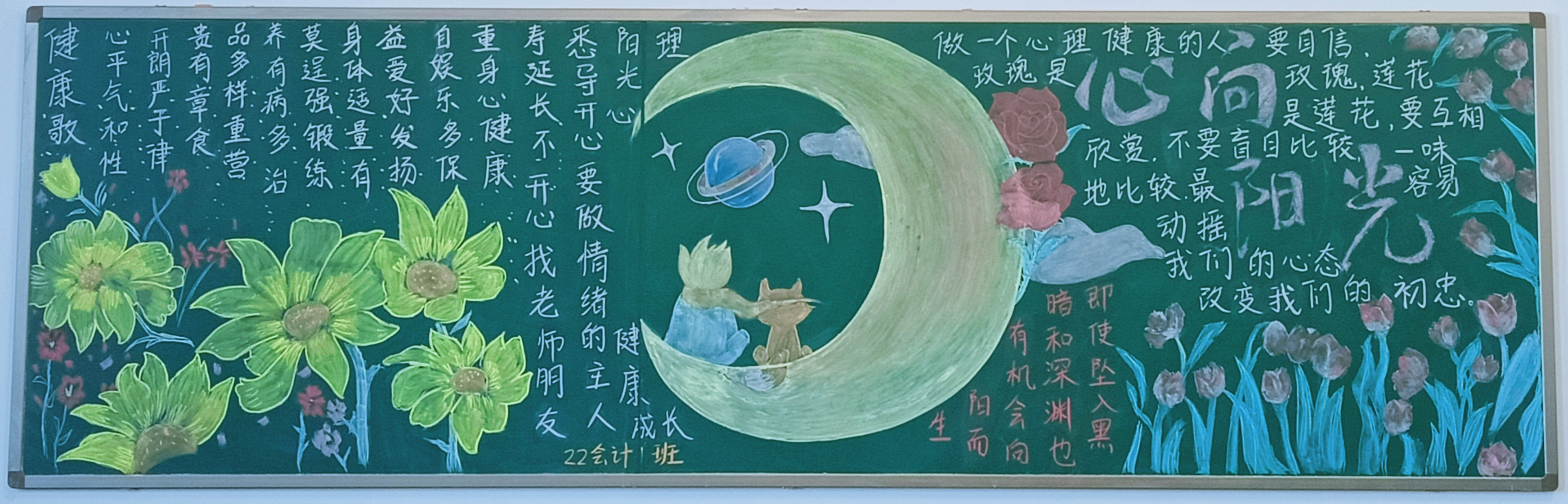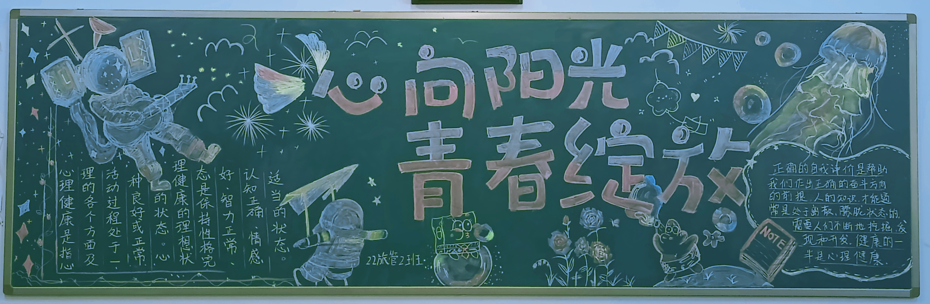 为了更好地宣传普及心理健康知识,让学生树立正确的心理健康观念,努力提高学生心理自我调节能力。5月15日至28日,大棒一进一出大大爽在2022级各班级开展了“心向阳光,青春绽放”为主题的心理健康教育主题黑板报评比活动。