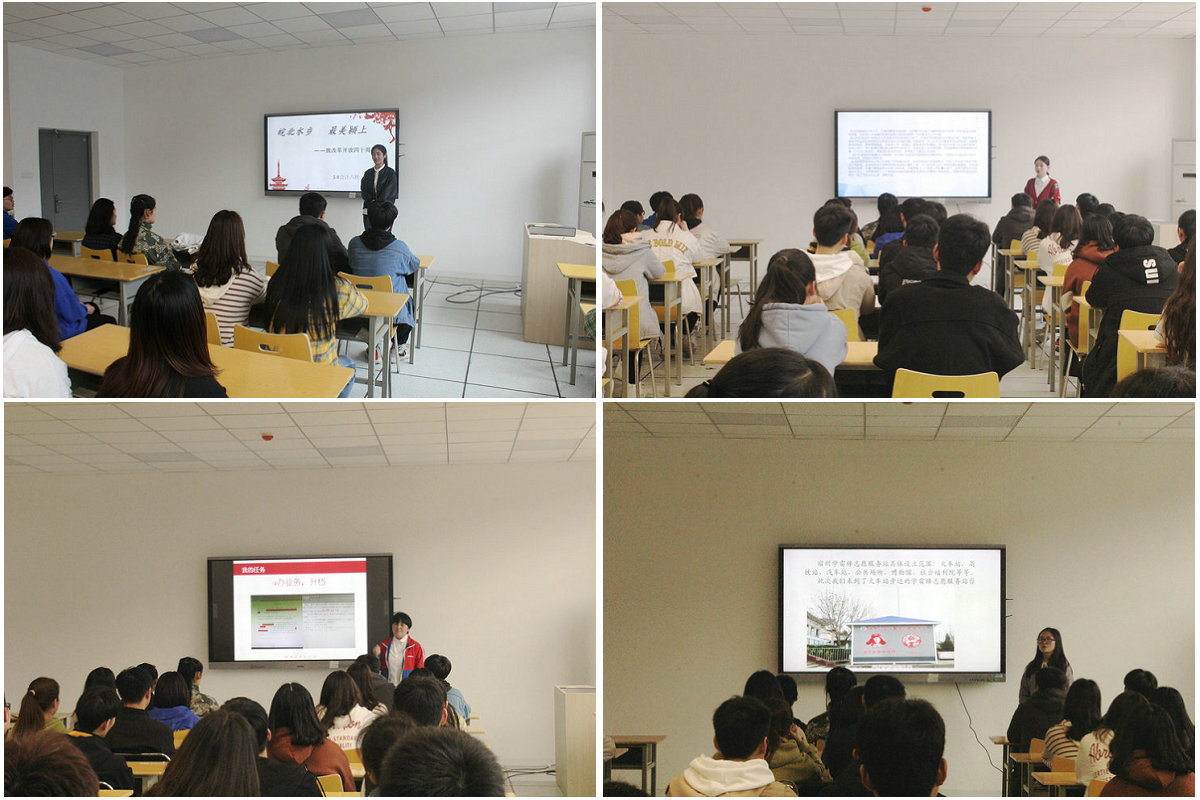会上,社会实践分享者依次用PPT展示了自己的寒假社会实践活动,讲述了自己在实践中的经历与体会。同学们参与社会实践的方式各有不同,有志愿服务类,去敬老院看望老人,火车站旁当志愿者;有改革开放之我见,分享自己和家乡在改革开放中的成长与变化;有回访母校,探望恩师,并向学弟学妹介绍自己的大学,助力宣传我校,客串了一回学校招生志愿宣传员;有专业实践,结合自身专业提前模拟职业角色,反思自己的学业不足。丰富的内容、真挚的情感、深刻的体会,让在场的同学们深受启发,纷纷表示受益匪浅。