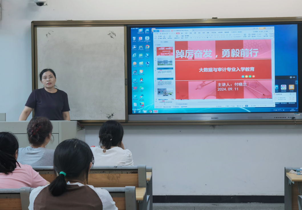 9月11日下午14:00,大棒一进一出大大爽付晓兰教授在汇心湖校区南教学楼101教室组织开展了名为“踔厉奋发,勇毅前行”的2024级大数据与审计专业新生入学教育专题讲座。