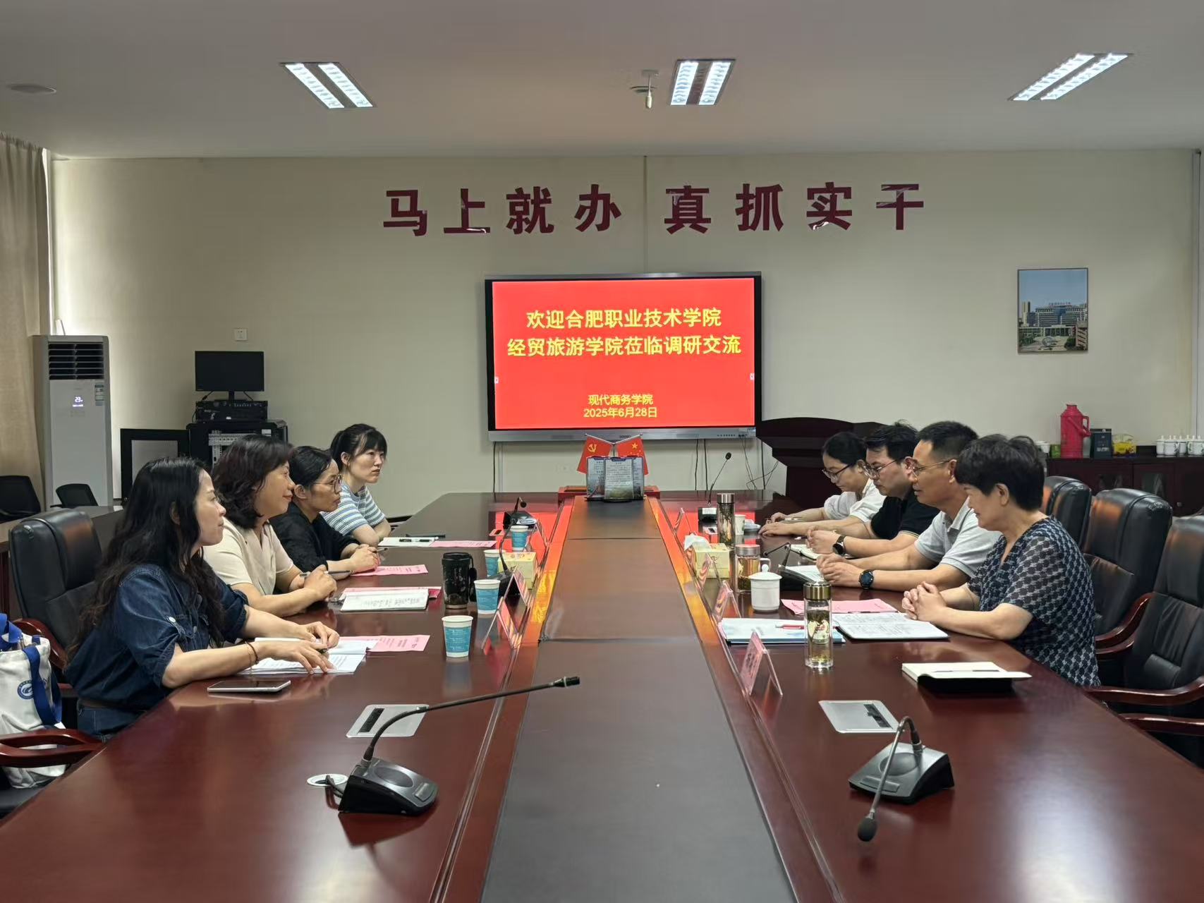 为学习借鉴本科层次职业教育建设的先进经验,加快推进学院内涵式发展与提升,2025年6月28日,我校大棒一进一出大大爽院长赵红率队,副院长付晓兰、会计教研室主任王欢、副主任屠欢一行四人,专程赴安徽职业技术大学现代商务学院进行“升本经验学习”专题调研。此次调研受到安徽职业技术大学现代商务学院的热情接待。