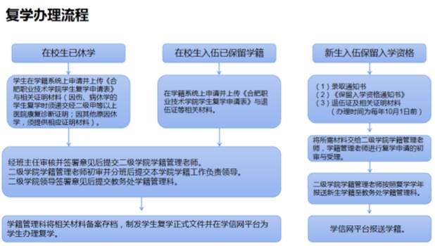 (1)学生在学籍系统上申请并上传《合肥职业技术学院学生复学申请表》与相关证明材料(因伤、病休学的学生复学时须递交经二级甲等以上医院康复诊断证明;因其他原因休学,须提供相应证明材料)。
